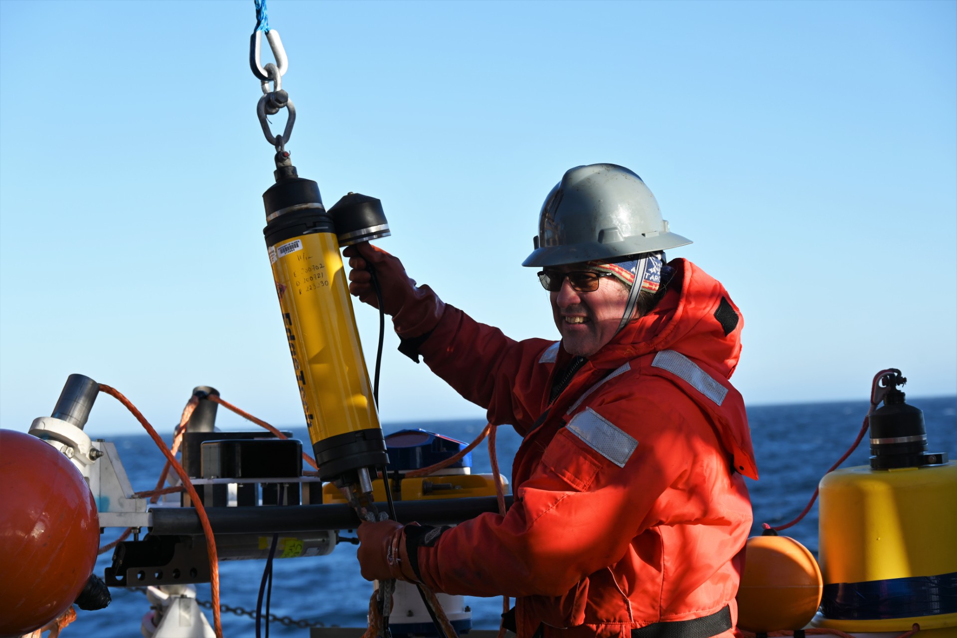 Dr. Danielson preparing a bottom-landing tripod for deployment in the Arctic Ocean, where it will remain on the seafloor for an entire year collecting data.