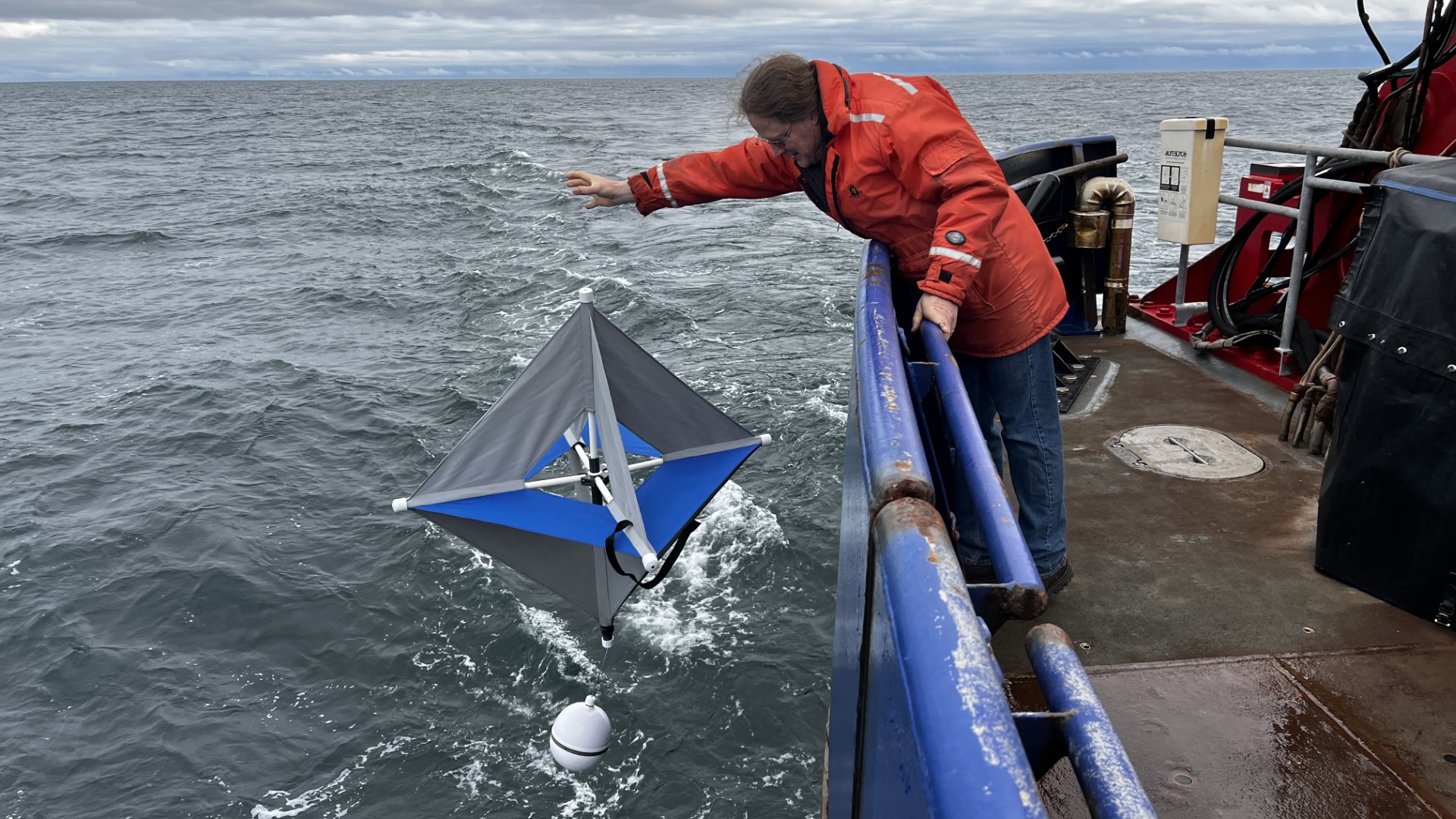 Dr. Danielson deploying a satellite-tracked oceanographic drifter, which measures ocean surface currents, in the Gulf of Alaska.